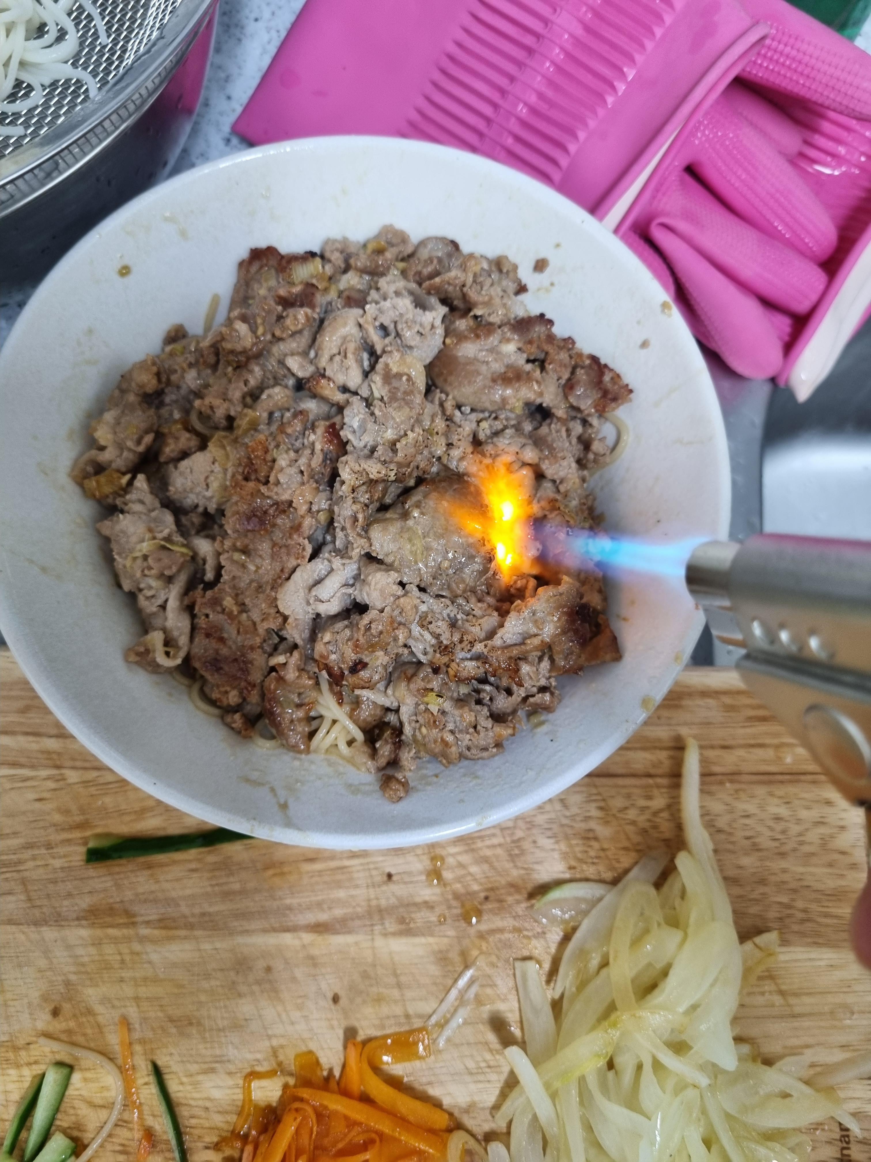 먼저 고기를 올려주었는데 뭔가 갈색빛이 더 나길원해서 토치로 조금 지져주었다ㅋㅋㅋㅋ
